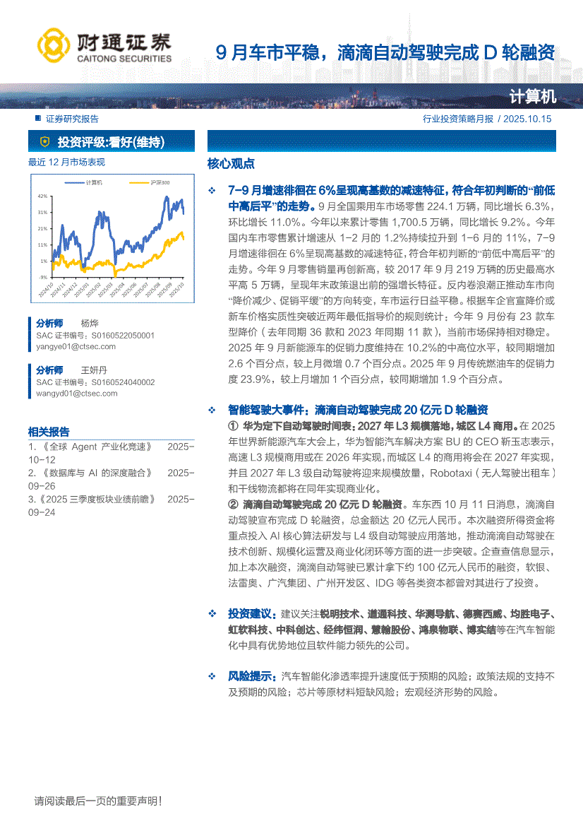 计算机行业:财通证券-计算机行业投资策略月报:9月车市平稳,滴滴自动驾驶完成D轮融资-251015