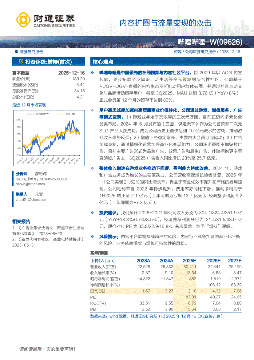 哔哩哔哩~W:财通证券-哔哩哔哩~W-9626.HK-内容扩圈与流量变现的双击-251216
