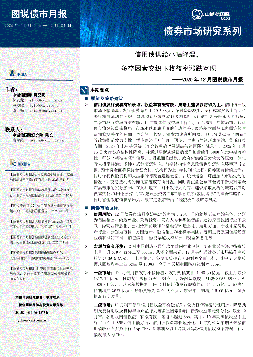 中诚信国际-2025年12月图说债市月报:信用债供给小幅降温,多空因素交织下收益率涨跌互现-251231
