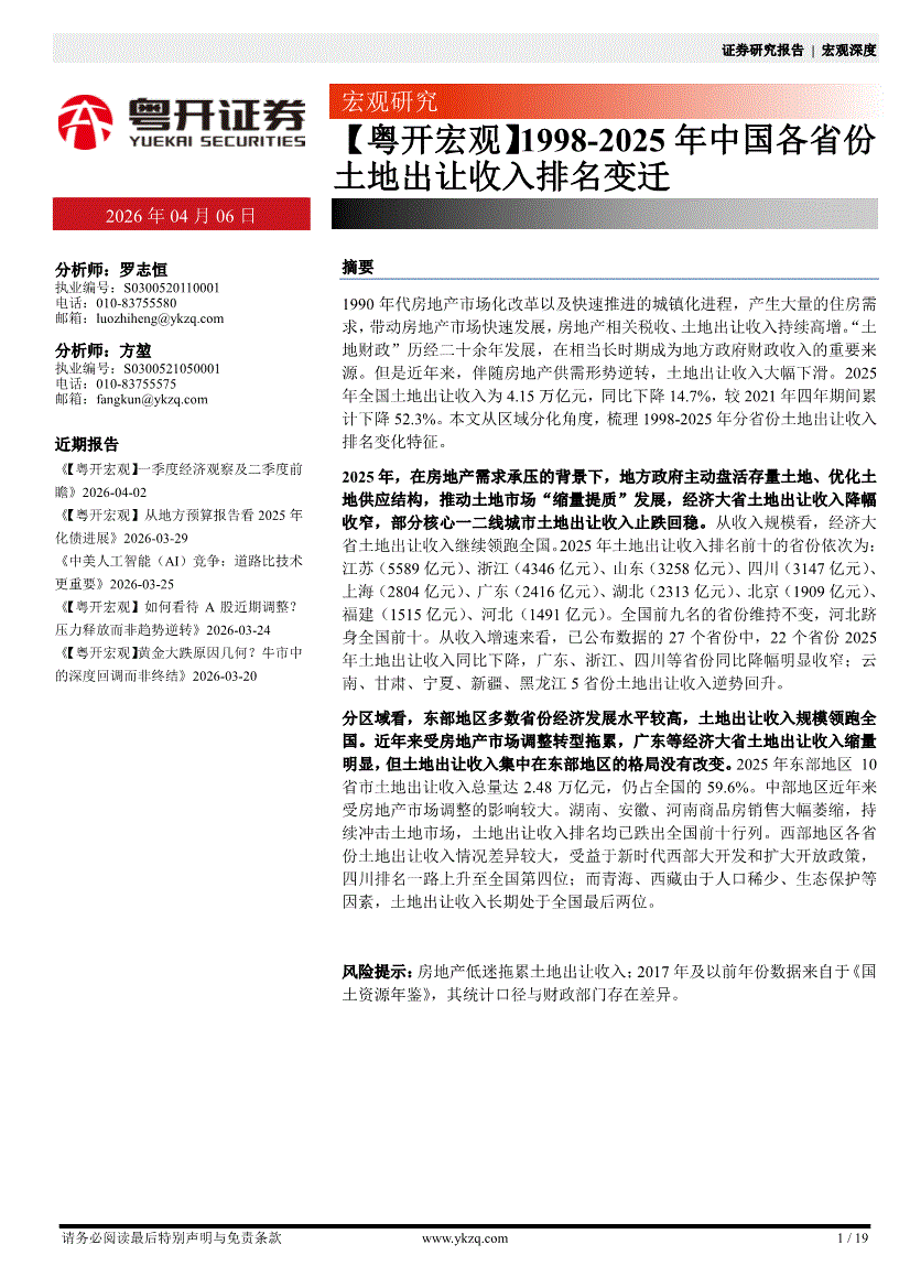 粤开证券-【粤开宏观】1998~2025年中国各省份土地出让收入排名变迁-260406