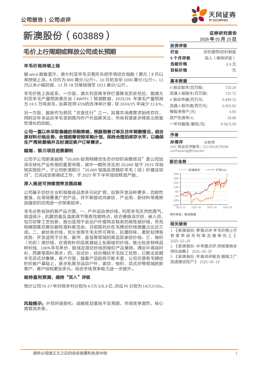 新澳股份:天风证券-新澳股份-603889-毛价上行周期或释放公司成长预期-260115