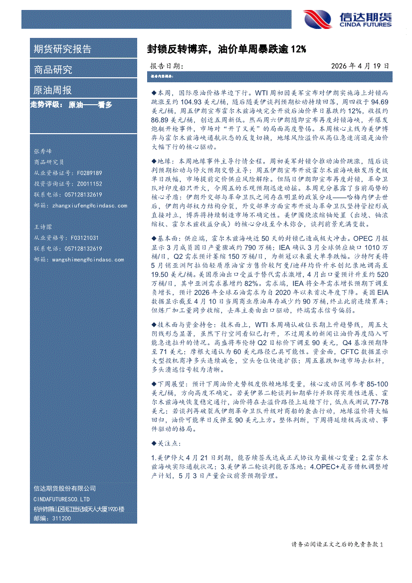 信达期货-原油周报:封锁反转博弈,油价单周暴跌逾12%-260419