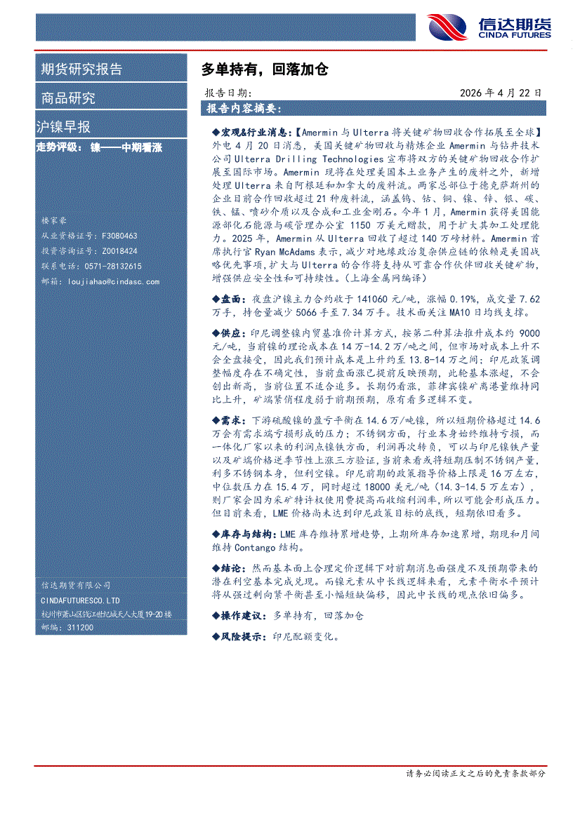 信达期货-沪镍早报:多单持有,回落加仓-260422