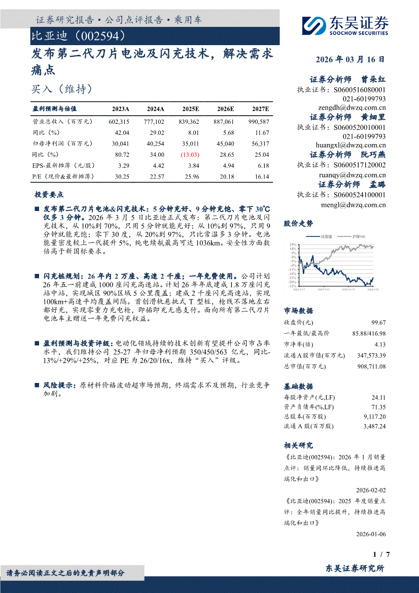 比亚迪:东吴证券-比亚迪-002594-发布第二代刀片电池及闪充技术,解决需求痛点-260316