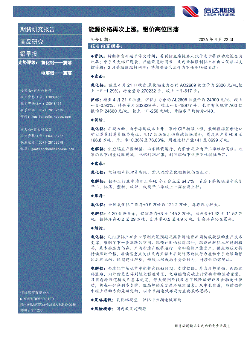 信达期货-铝早报:能源价格再次上涨,铝价高位回落-260422