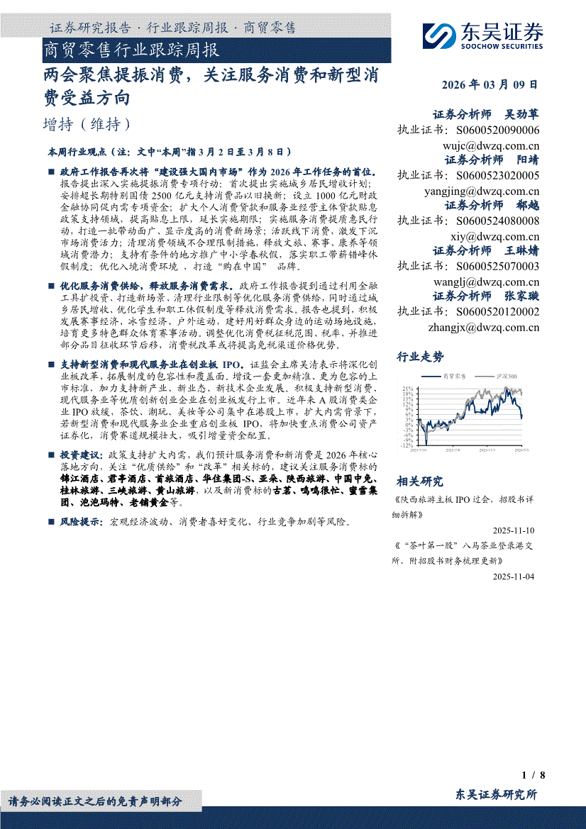 商贸零售行业:东吴证券-商贸零售行业跟踪周报:两会聚焦提振消费,关注服务消费和新型消费受益方向-260309