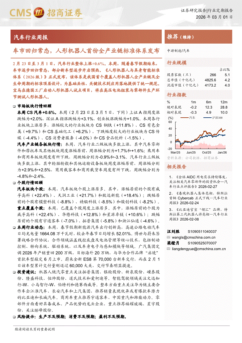 汽车行业:招商证券-汽车行业周报:车市回归常态,人形机器人首份全产业链标准体系发布-260301