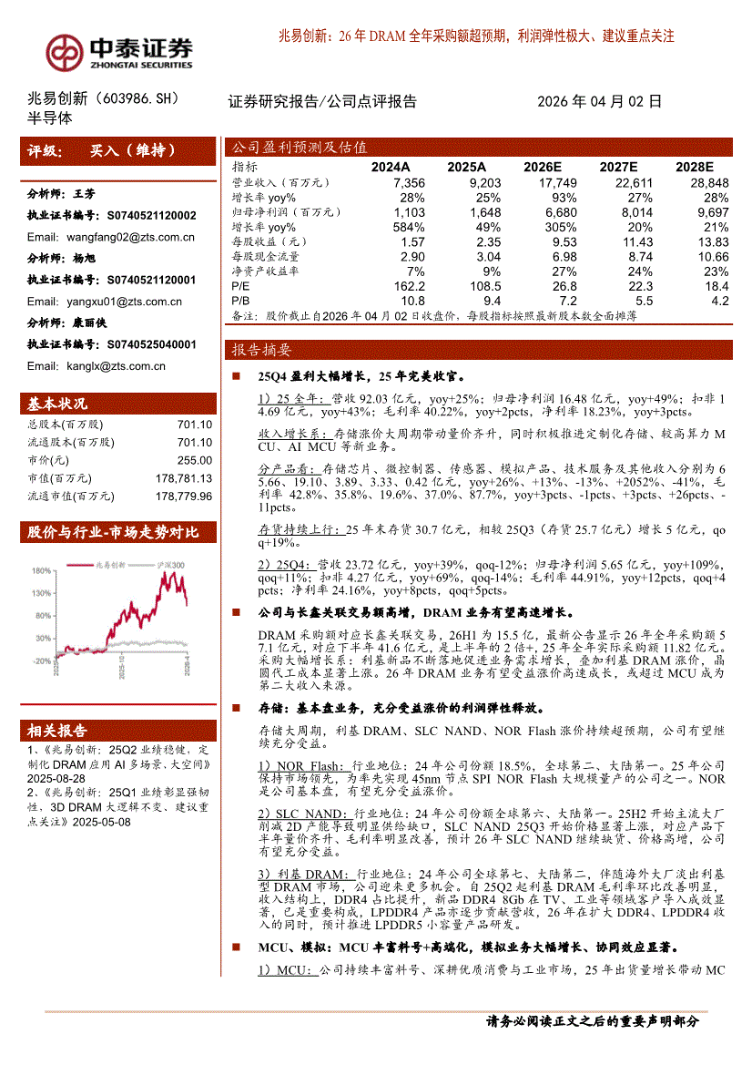 兆易创新:中泰证券-兆易创新-603986-26年DRAM全年采购额超预期,利润弹性极大、建议重点关注-260402