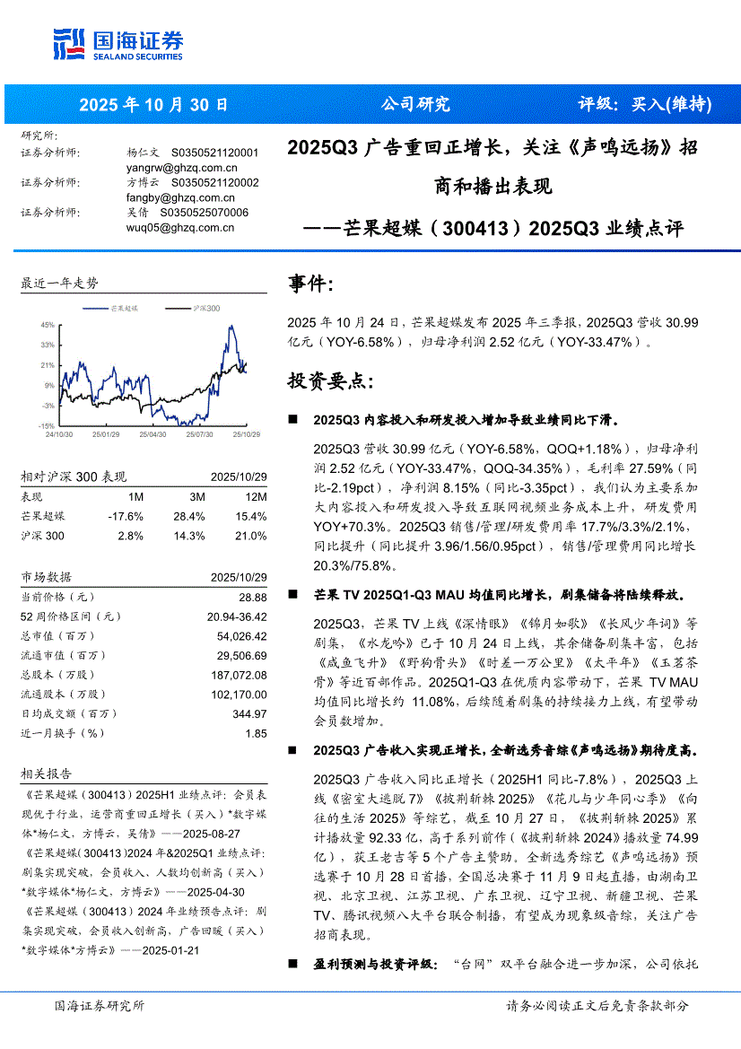 芒果超媒:国海证券-芒果超媒-300413-2025Q3业绩点评:2025Q3广告重回正增长,关注《声鸣远扬》招商和播出表现-251030