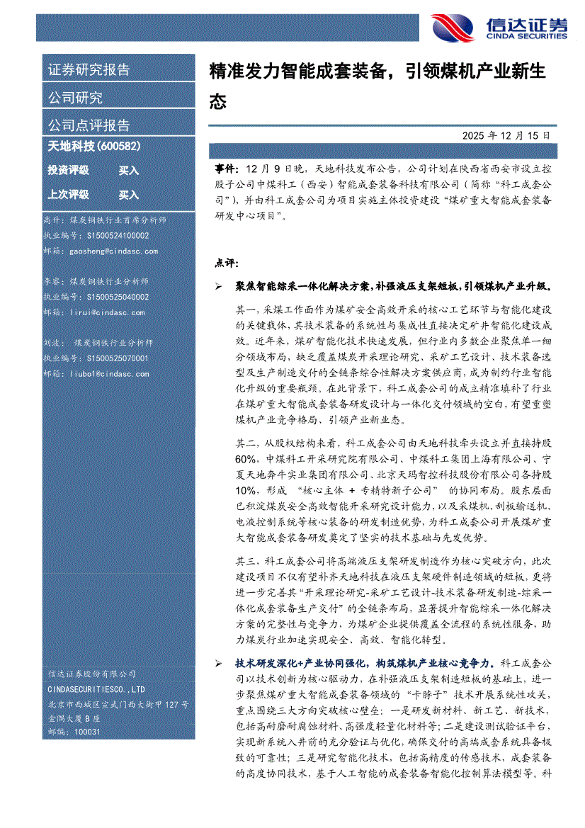 天地科技:信达证券-天地科技-600582-精准发力智能成套装备,引领煤机产业新生态-251215