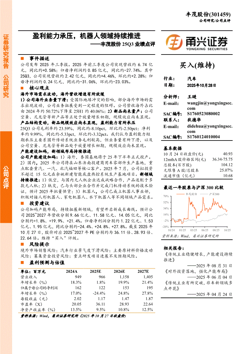 丰茂股份:甬兴证券-丰茂股份-301459-25Q3业绩点评:盈利能力承压,机器人领域持续推进-251028