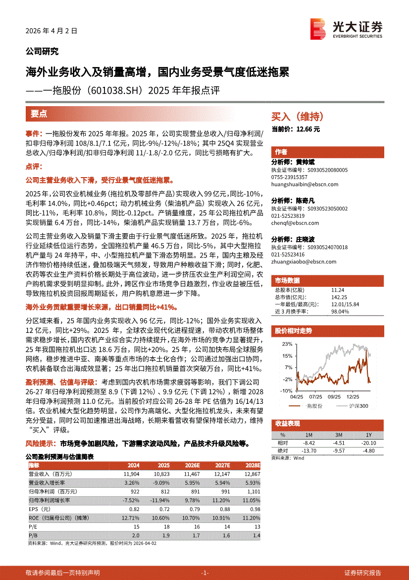 一拖股份:光大证券-一拖股份-601038-2025年年报点评:海外业务收入及销量高增,国内业务受景气度低迷拖累-260402