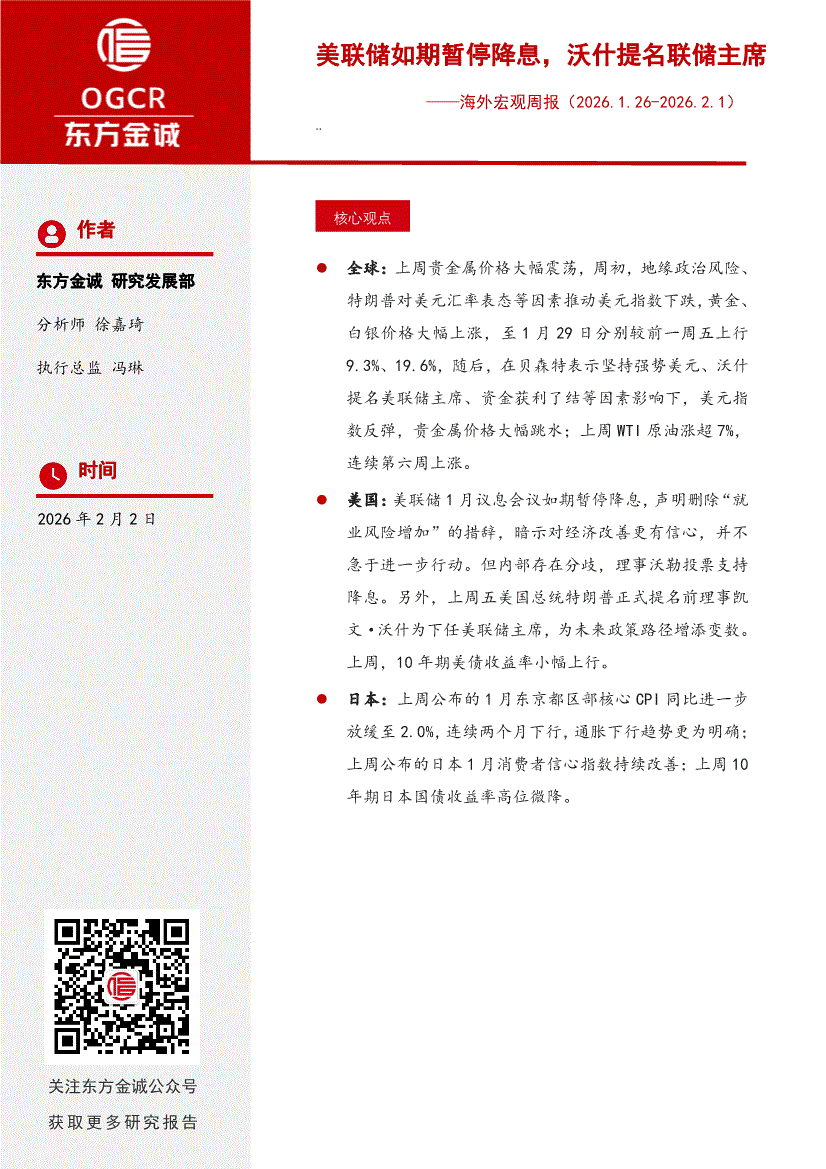 东方金诚-海外宏观周报:美联储如期暂停降息,沃什提名联储主席-260202