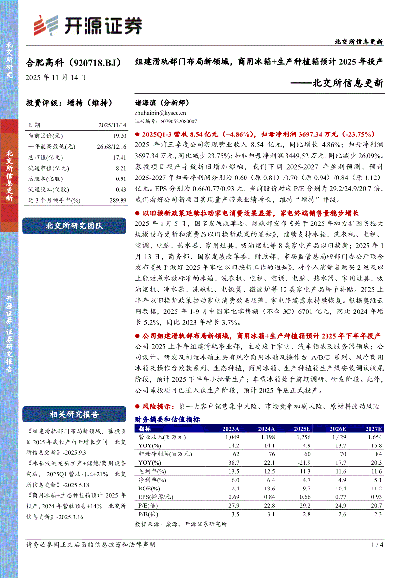 合肥高科:开源证券-合肥高科-920718-北交所信息更新:组建滑轨部门布局新领域,商用冰箱+生产种植箱预计2025年投产-251114