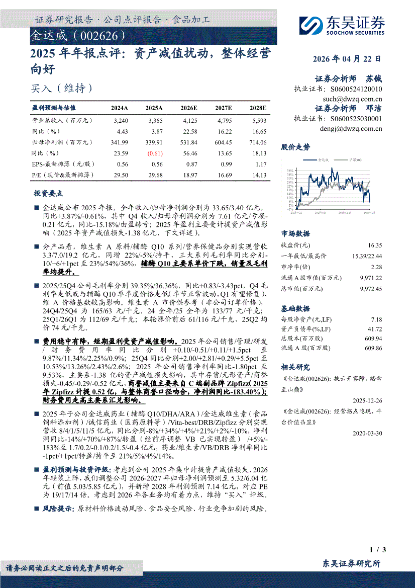 金达威:东吴证券-金达威-002626-2025年年报点评:资产减值扰动,整体经营向好-260422