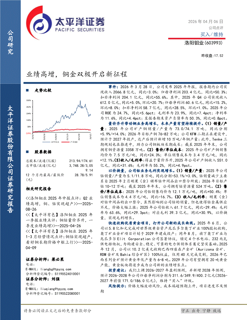 洛阳钼业:太平洋证券-洛阳钼业-603993-业绩高增,铜金双极开启新征程-260406