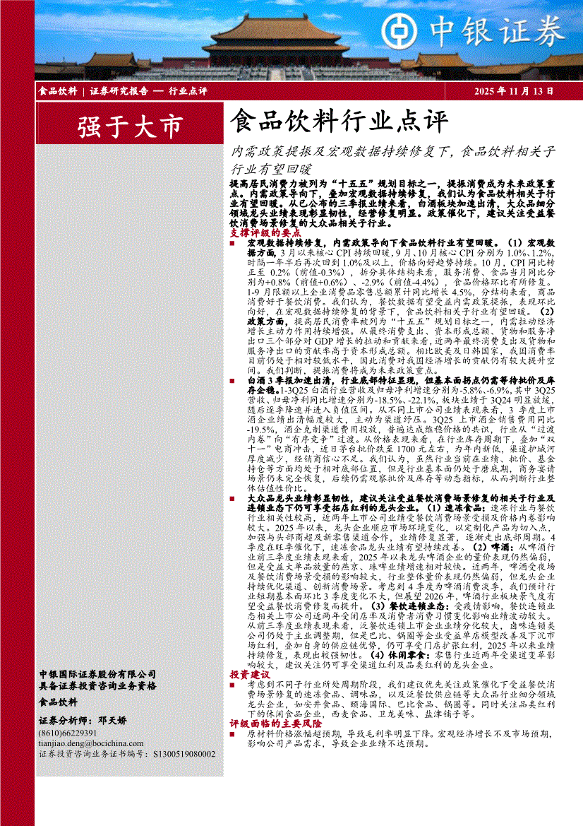 食品饮料行业:中银国际-食品饮料行业点评:内需政策提振及宏观数据持续修复下,食品饮料相关子行业有望回暖-251113