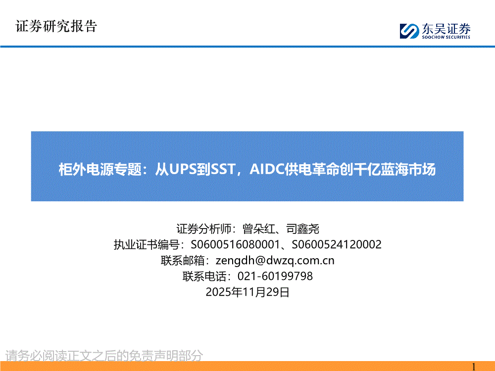 柜外电源行业:东吴证券-柜外电源行业专题:从UPS到SST,AIDC供电革命创千亿蓝海市场-251129