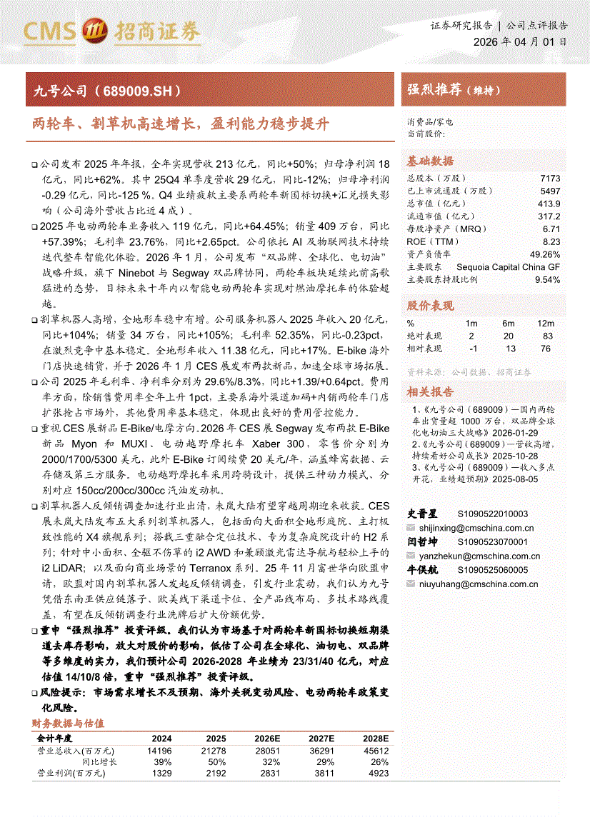 九号公司:招商证券-九号公司-689009-两轮车、割草机高速增长,盈利能力稳步提升-260401
