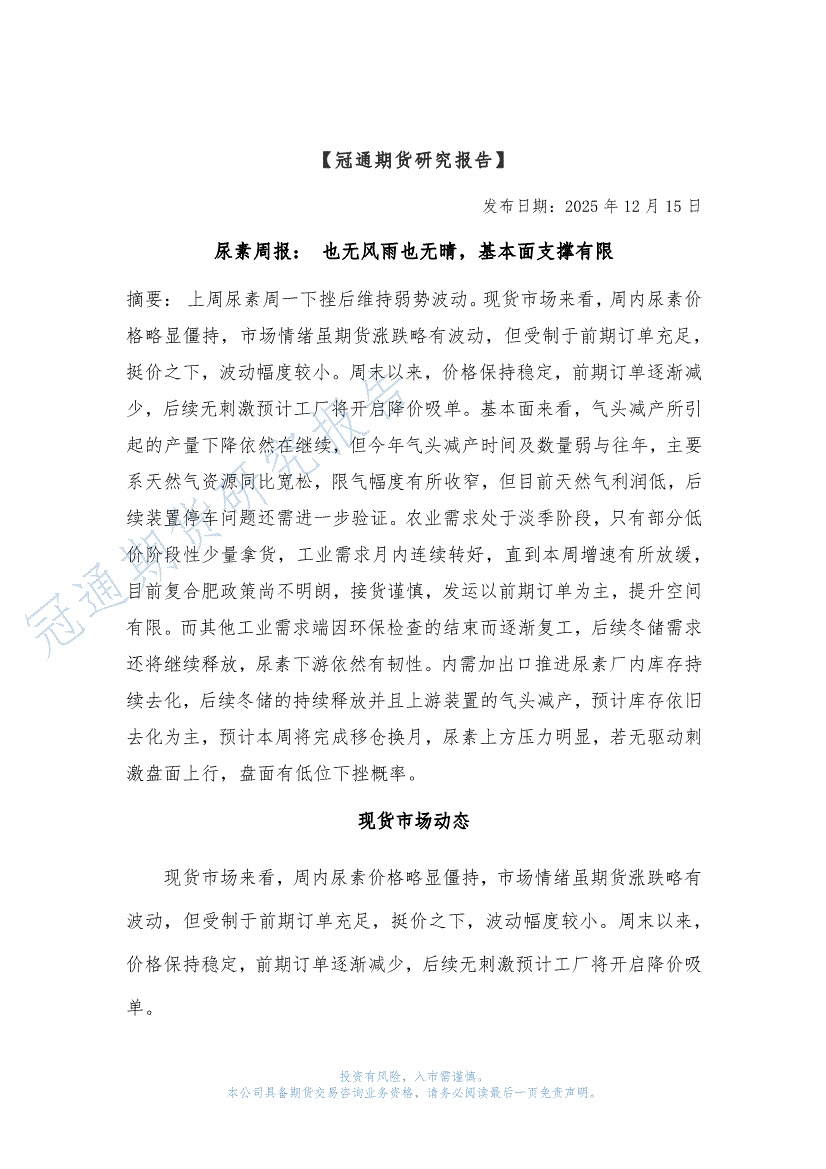 冠通期货-尿素周报:也无风雨也无晴,基本面支撑有限-251215