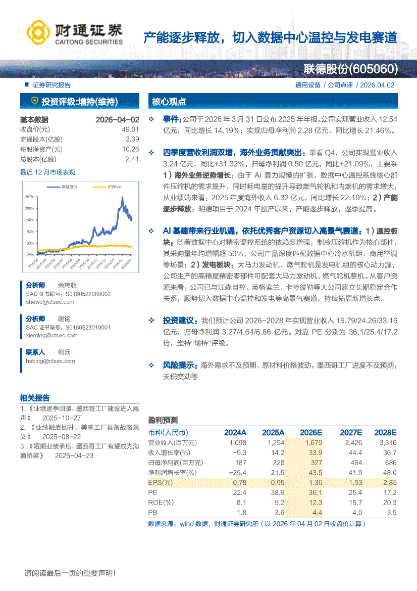 联德股份:财通证券-联德股份-605060-产能逐步释放,切入数据中心温控与发电赛道-260402