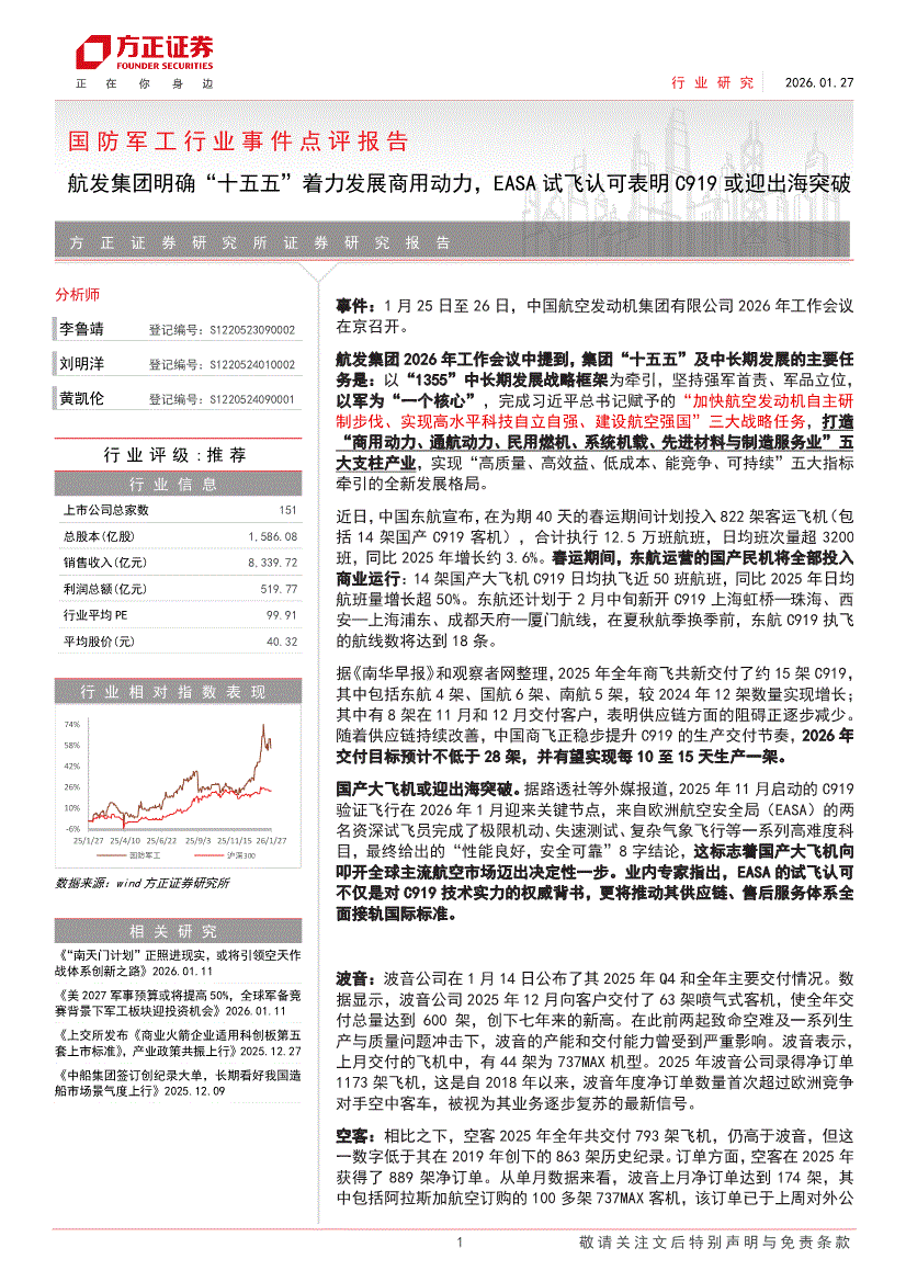 国防军工行业:方正证券-国防军工行业事件点评报告:航发集团明确“十五五”着力发展商用动力,EASA试飞认可表明C919或迎出海突破-260127