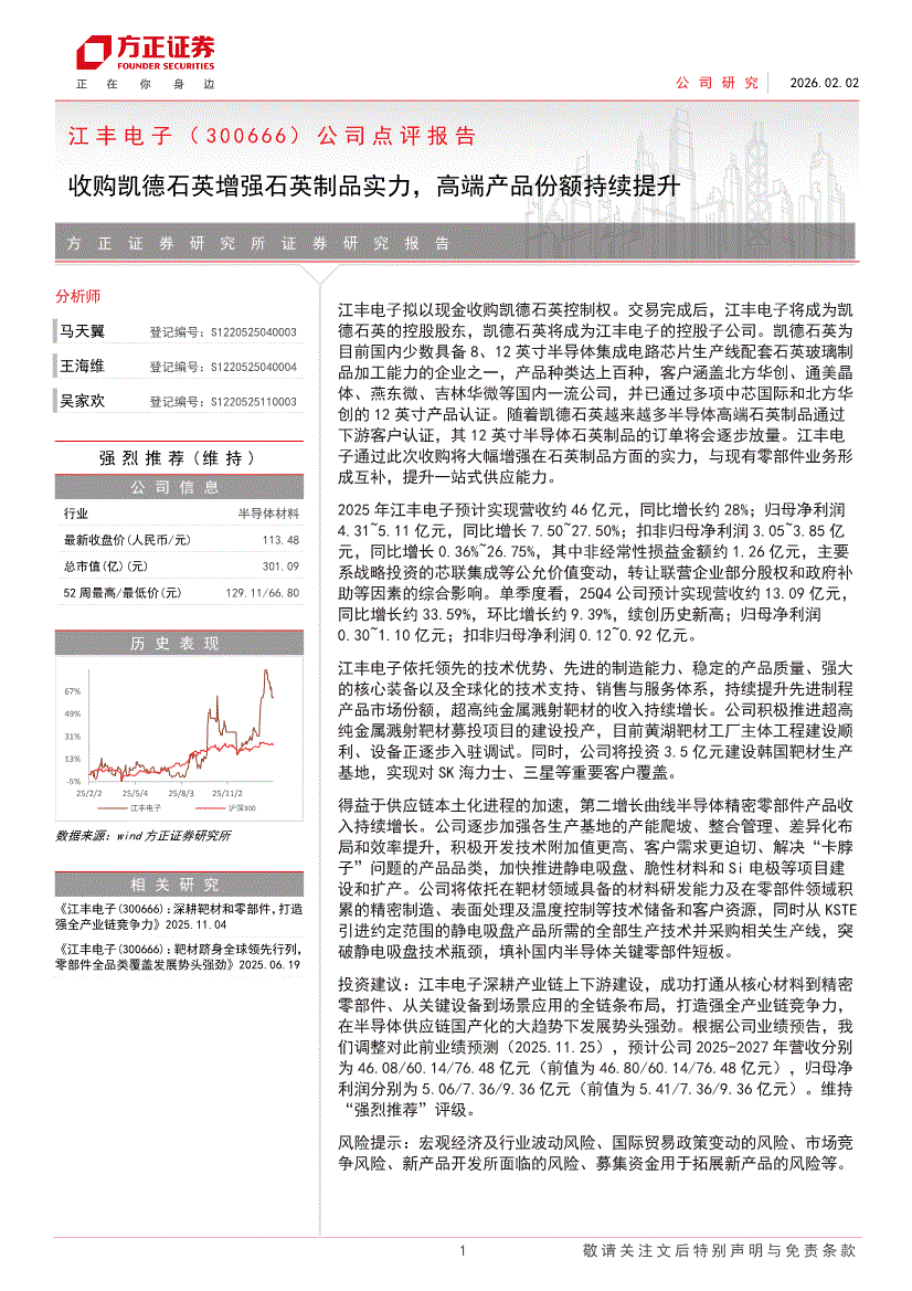 江丰电子:方正证券-江丰电子-300666-公司点评报告:收购凯德石英增强石英制品实力,高端产品份额持续提升-260202
