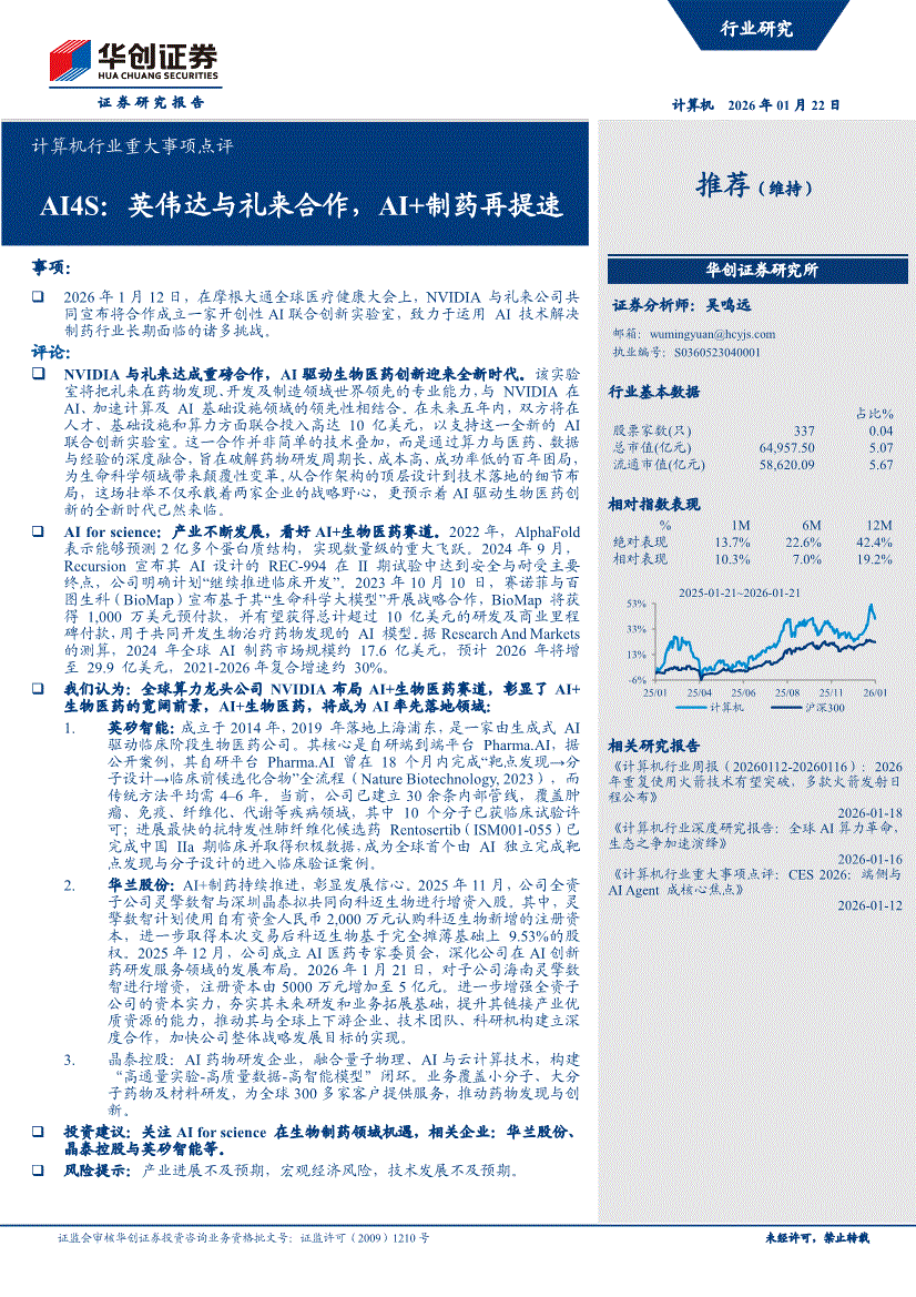 计算机行业:华创证券-计算机行业重大事项点评:AI4S,英伟达与礼来合作,AI+制药再提速-260122