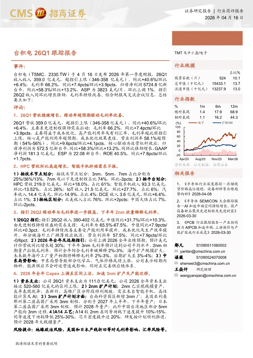 电子行业:招商证券-电子行业台积电26Q1跟踪报告:26Q1营收及毛利率超预期,上调2026年Capex至指引区间高位-260416