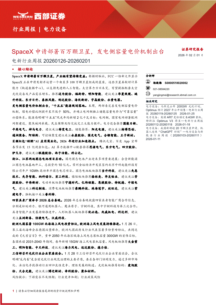 电力设备行业:西部证券-电新行业周报:SpaceX申请部署百万颗卫星,发电侧容量电价机制出台-260201