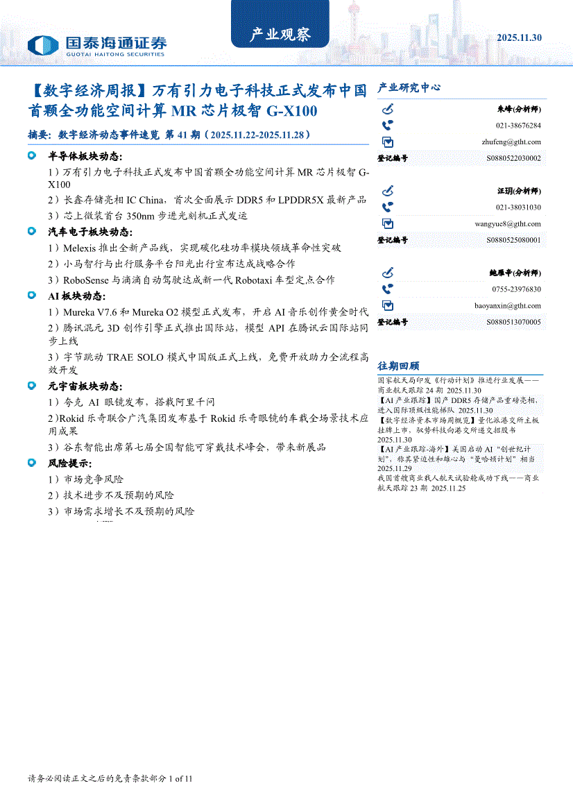 国泰海通证券-产业观察:【数字经济周报】万有引力电子科技正式发布中国首颗全功能空间计算MR芯片极智G~X100-251130