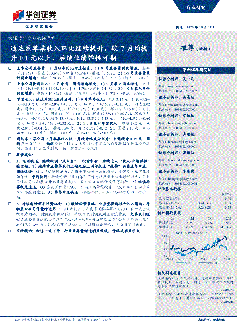 快递行业:华创证券-快递行业9月数据点评:通达系单票收入环比继续提升,较7月均提升0.1元以上,后续业绩弹性可期-251018