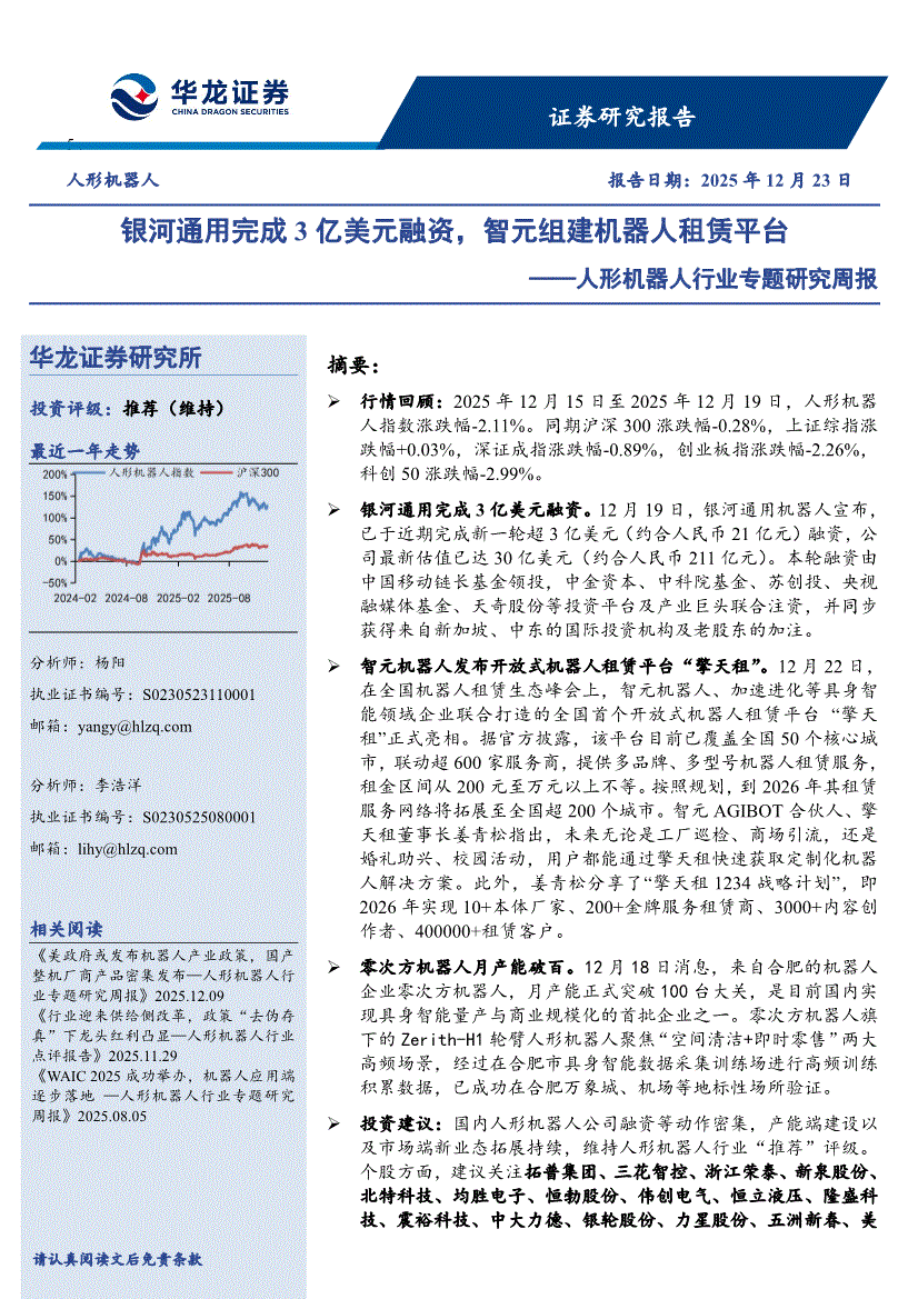 人形机器人行业:华龙证券-人形机器人行业专题研究周报:银河通用完成3亿美元融资,智元组建机器人租赁平台-251223