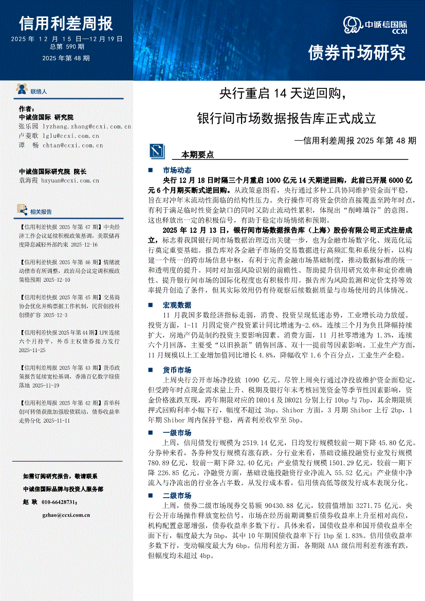 中诚信国际-信用利差周报2025年第48期:央行重启14天逆回购,银行间市场数据报告库正式成立-251219