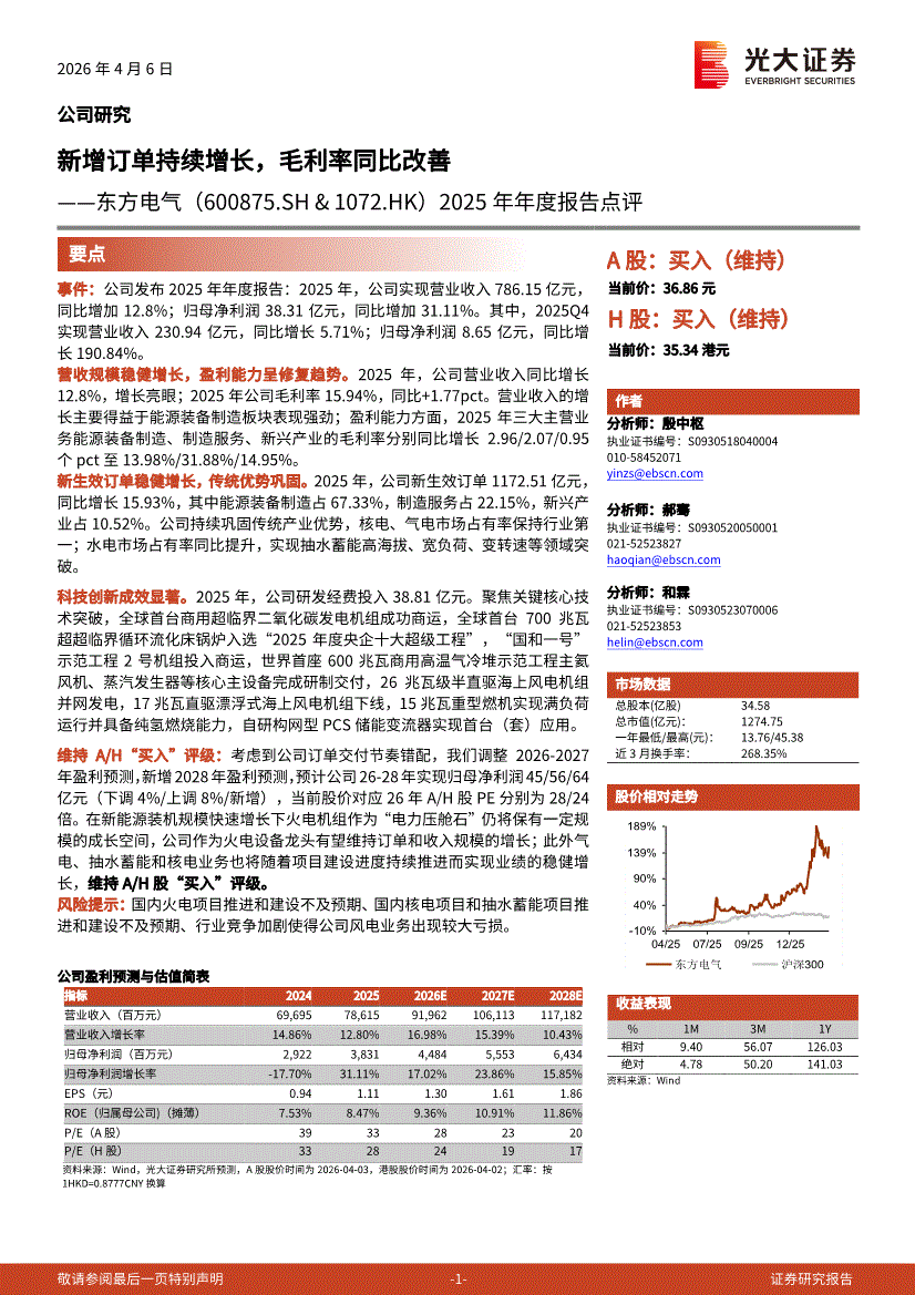东方电气:光大证券-东方电气-600875-2025年年度报告点评:新增订单持续增长,毛利率同比改-260406