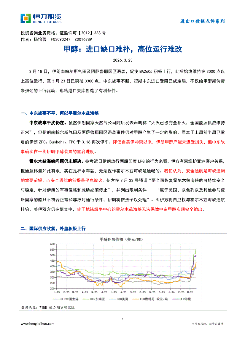 恒力期货-甲醇:进口缺口难补,高位运行难改-260323