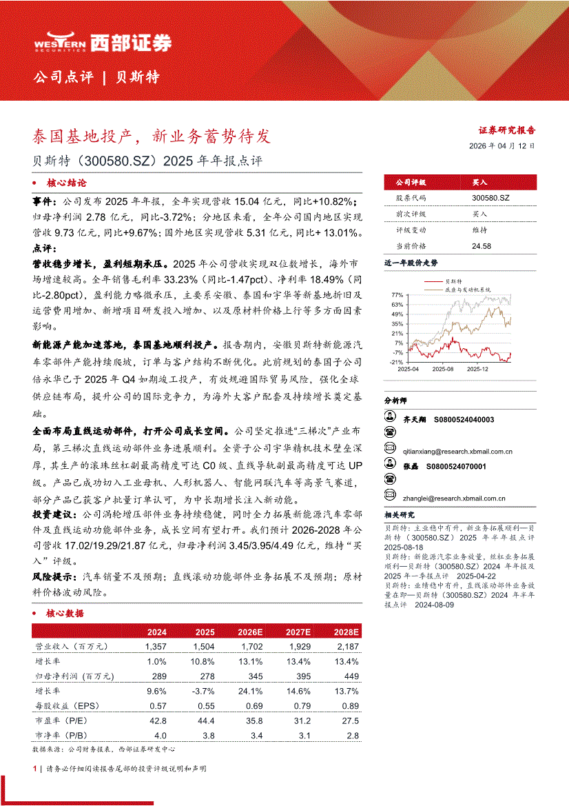 贝斯特:西部证券-贝斯特-300580-2025年年报点评:泰国基地投产,新业务蓄势待发-260412