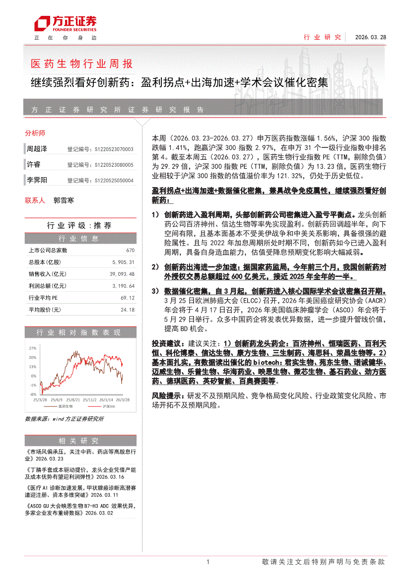 医药生物行业:方正证券-医药生物行业周报:继续强烈看好创新药,盈利拐点+出海加速+学术会议催化密集-260328