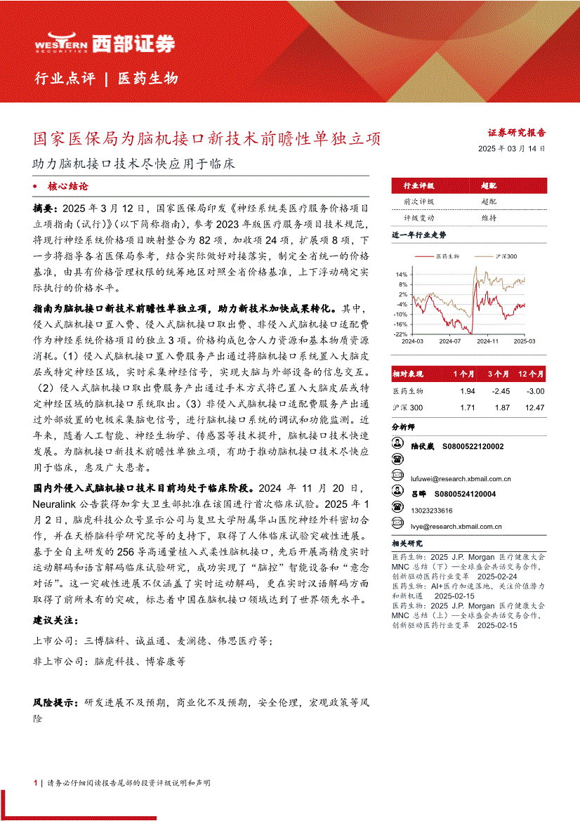 医药生物行业:西部证券-医药生物行业助力脑机接口技术尽快应用于临床:国家医保局为脑机接口新技术前瞻性单独立项-250314