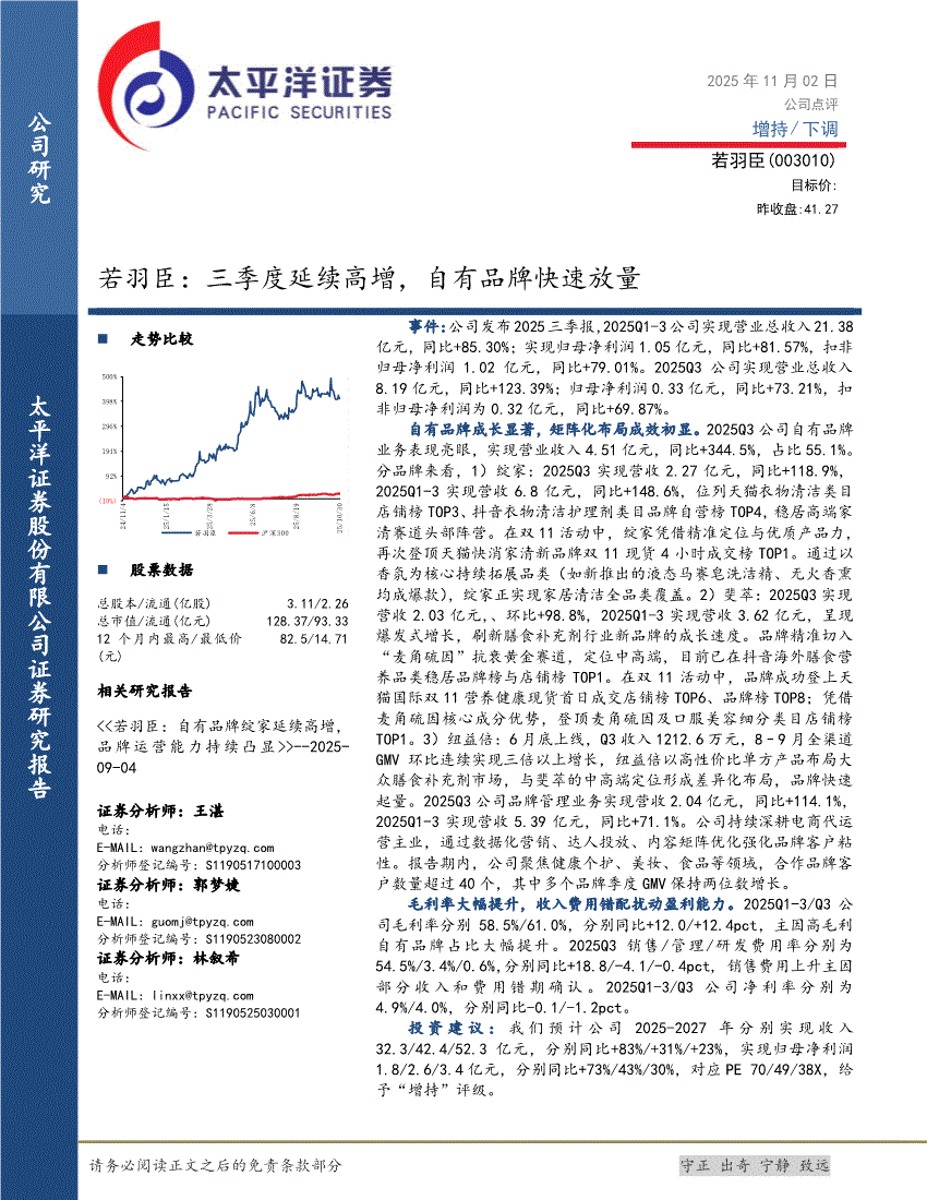 若羽臣:太平洋证券-若羽臣-003010-三季度延续高增,自有品牌快速放量-251102