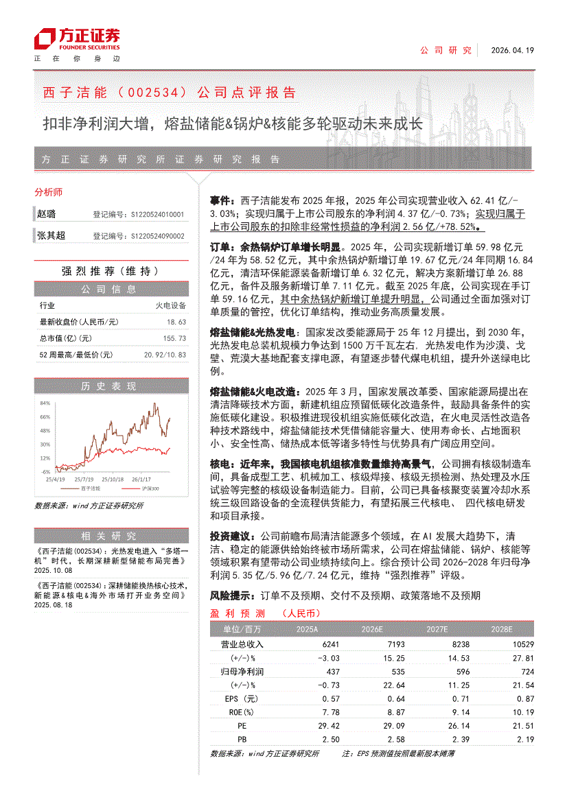 西子洁能:方正证券-西子洁能-002534-公司点评报告:扣非净利润大增,熔盐储能&锅炉&核能多轮驱动未来成长-260419