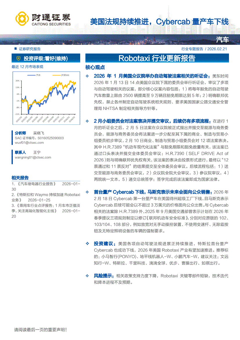 Robotaxi行业:财通证券-Robotaxi行业更新报告:美国法规持续推进,Cybercab量产车下线-260221