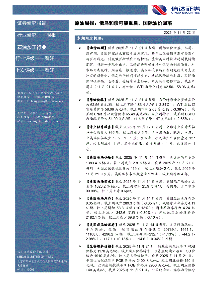 石油加工行业:信达证券-石油加工行业原油周报:俄乌和谈可能重启,国际油价回落-251123