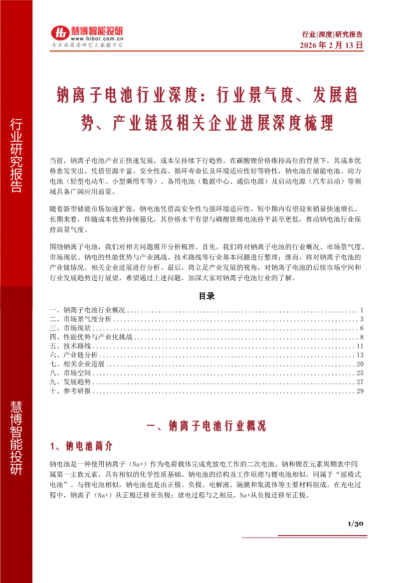 钠离子电池行业:慧博智能投研-钠离子电池行业深度:行业景气度、发展趋势、产业链及相关企业进展深度梳理-260213