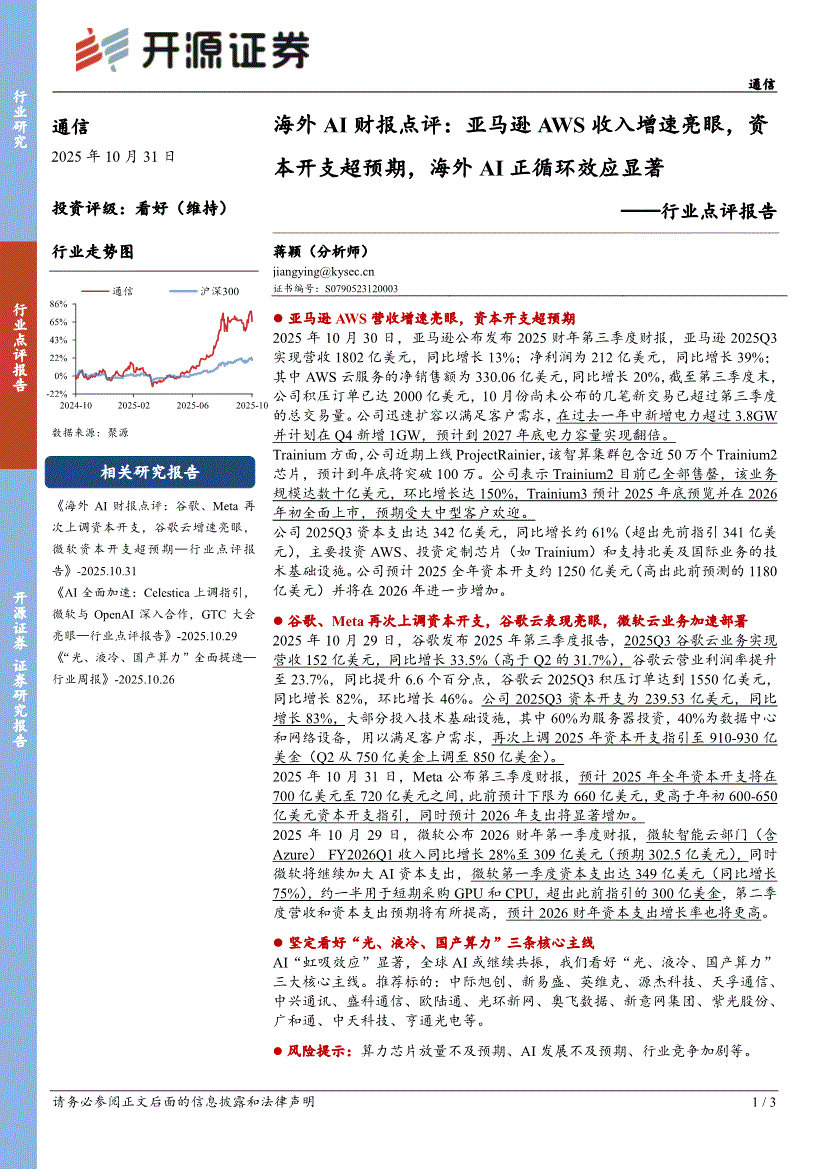 通信行业:开源证券-通信行业点评报告:海外AI财报点评,亚马逊AWS收入增速亮眼,资本开支超预期,海外AI正循环效应显著-251031