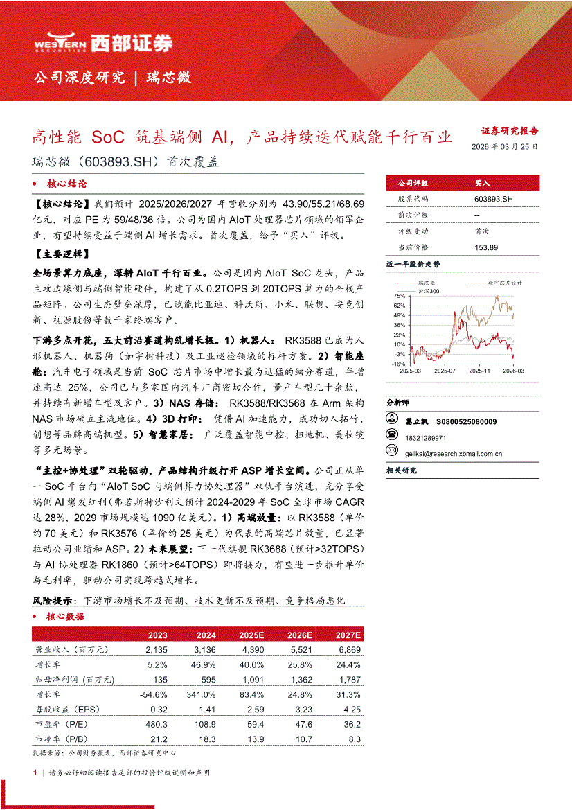 瑞芯微:西部证券-瑞芯微-603893-首次覆盖:高性能SoC筑基端侧AI,产品持续迭代赋能千行百业-260325