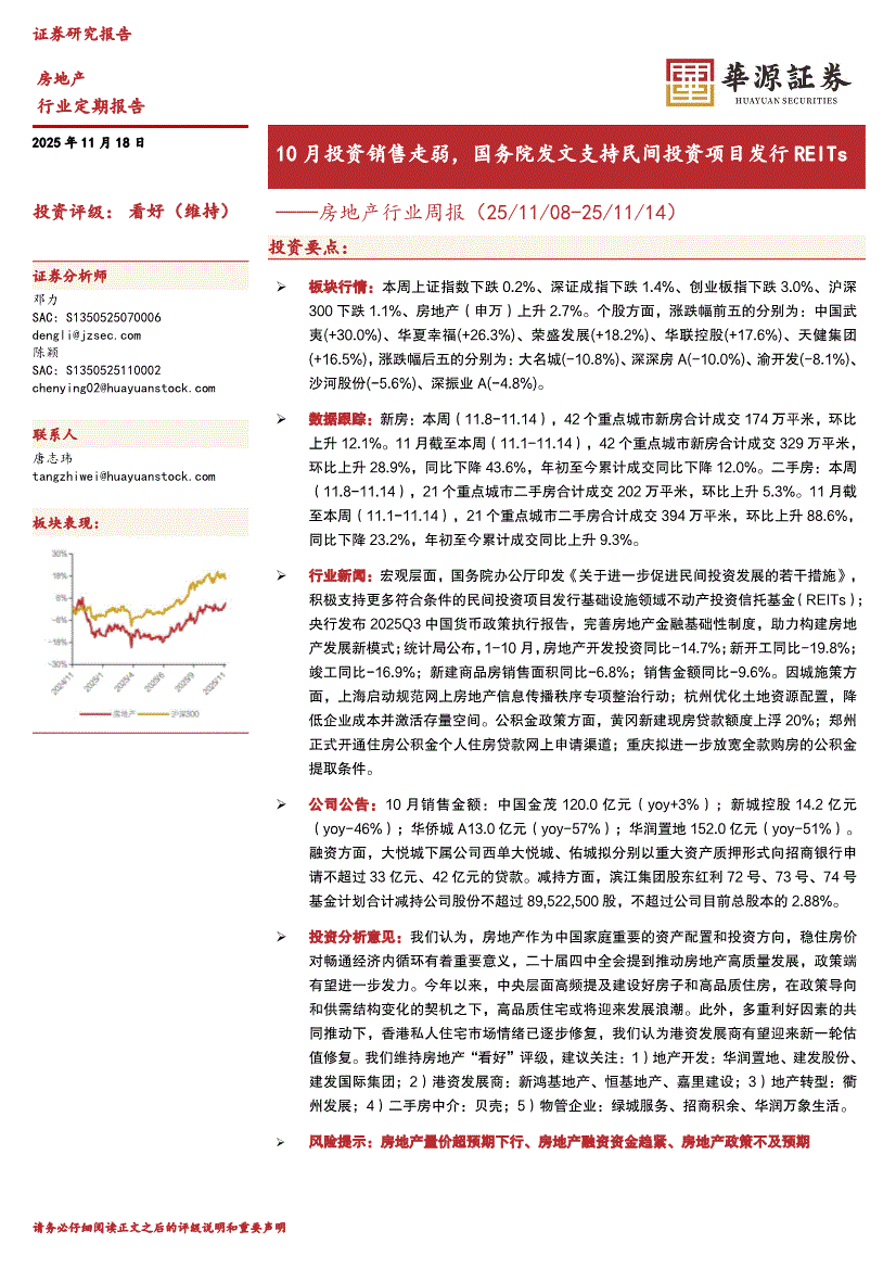 房地产行业:华源证券-房地产行业周报:10月投资销售走弱,国务院发文支持民间投资项目发行REITs-251118