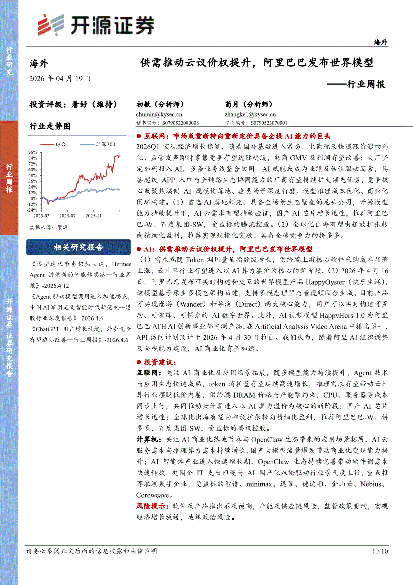 科技行业:开源证券-海外科技行业周报:供需推动云议价权提升,阿里巴巴发布世界模型-260419
