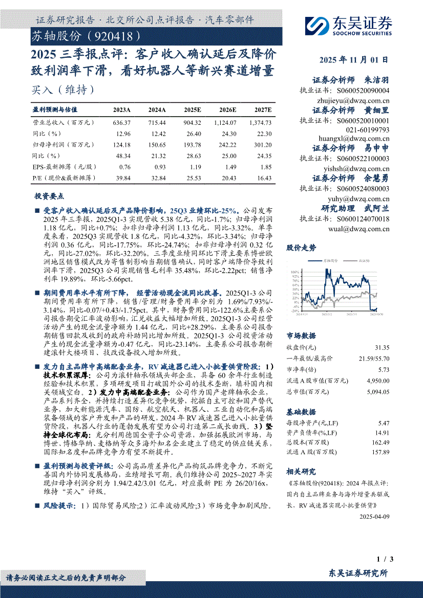 苏轴股份:东吴证券-苏轴股份-920418-2025三季报点评:客户收入确认延后及降价致利润率下滑,看好机器人等新兴赛道增量-251101