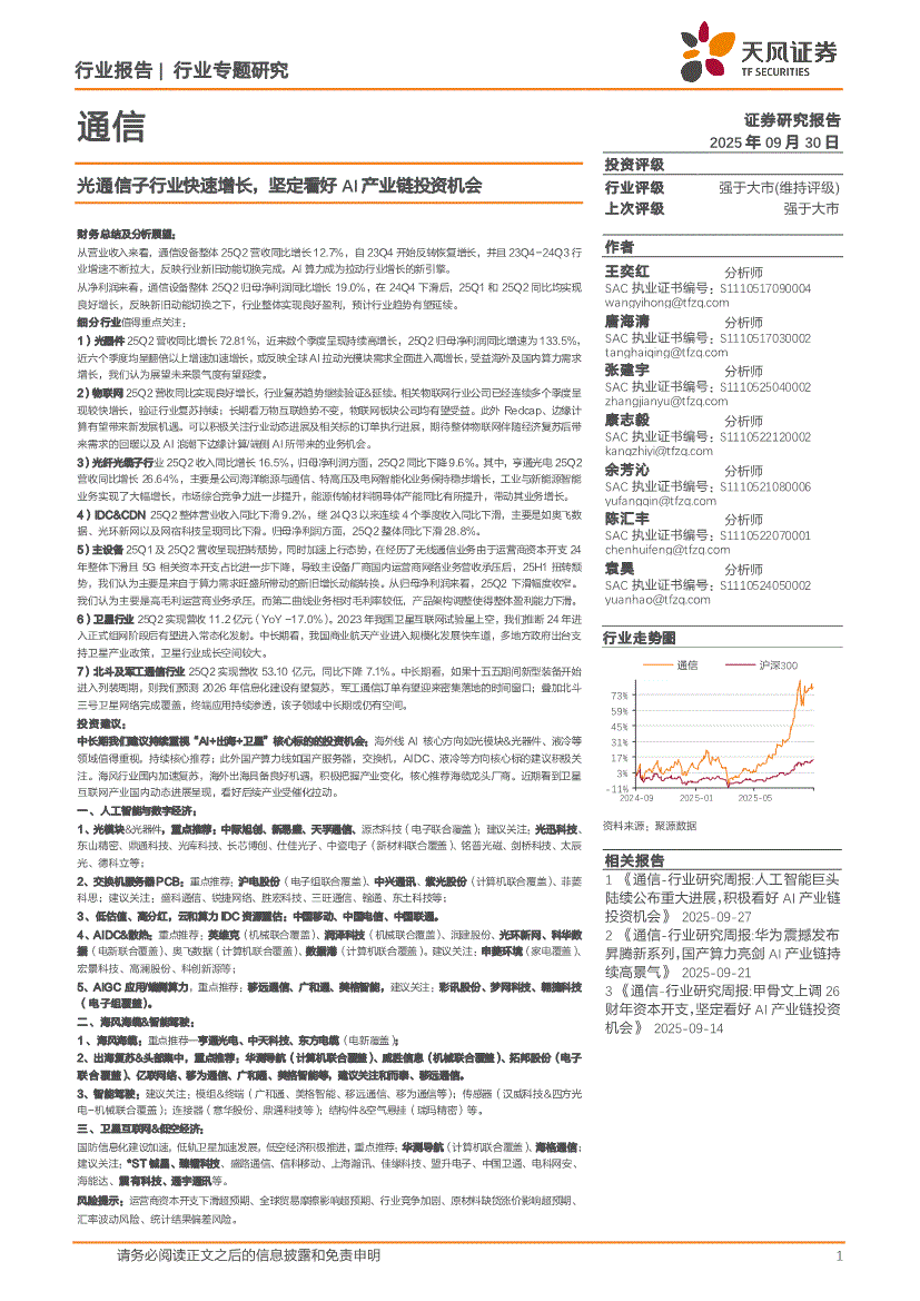 通信行业:天风证券-通信行业:光通信子行业快速增长,坚定看好AI产业链投资机会-250930